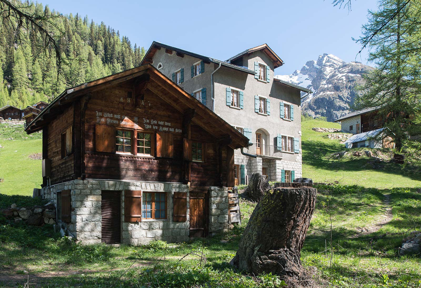 They still exist, the forgotten and secluded places. One of them is up here, just around the corner - and yet it's an insider tip. Here at the end of the Lötschental, in the middle of a small larch forest, at 1789 m above sea level, lies the venerable Hotel Fafleralp surrounded by its chalet annexes - our hideaway resort.